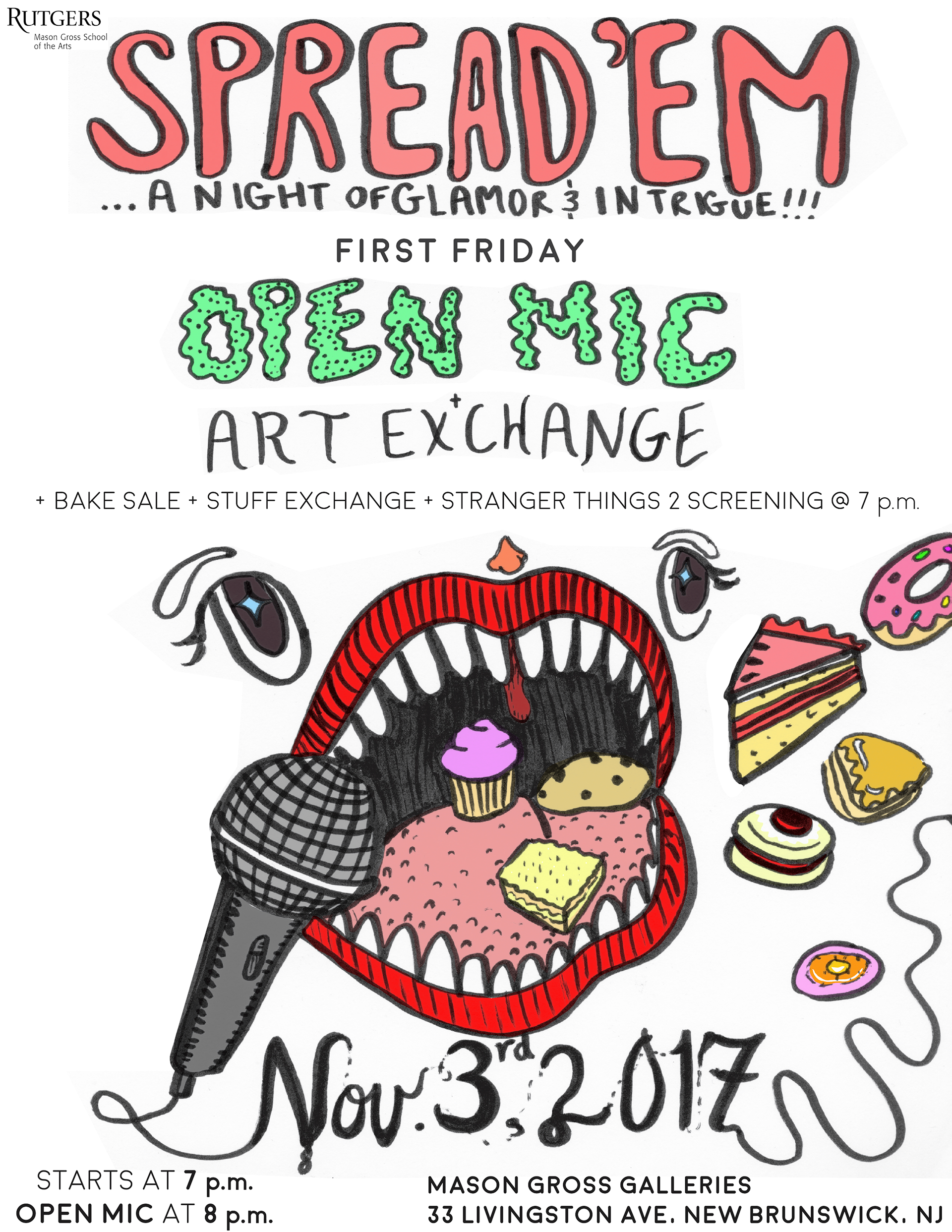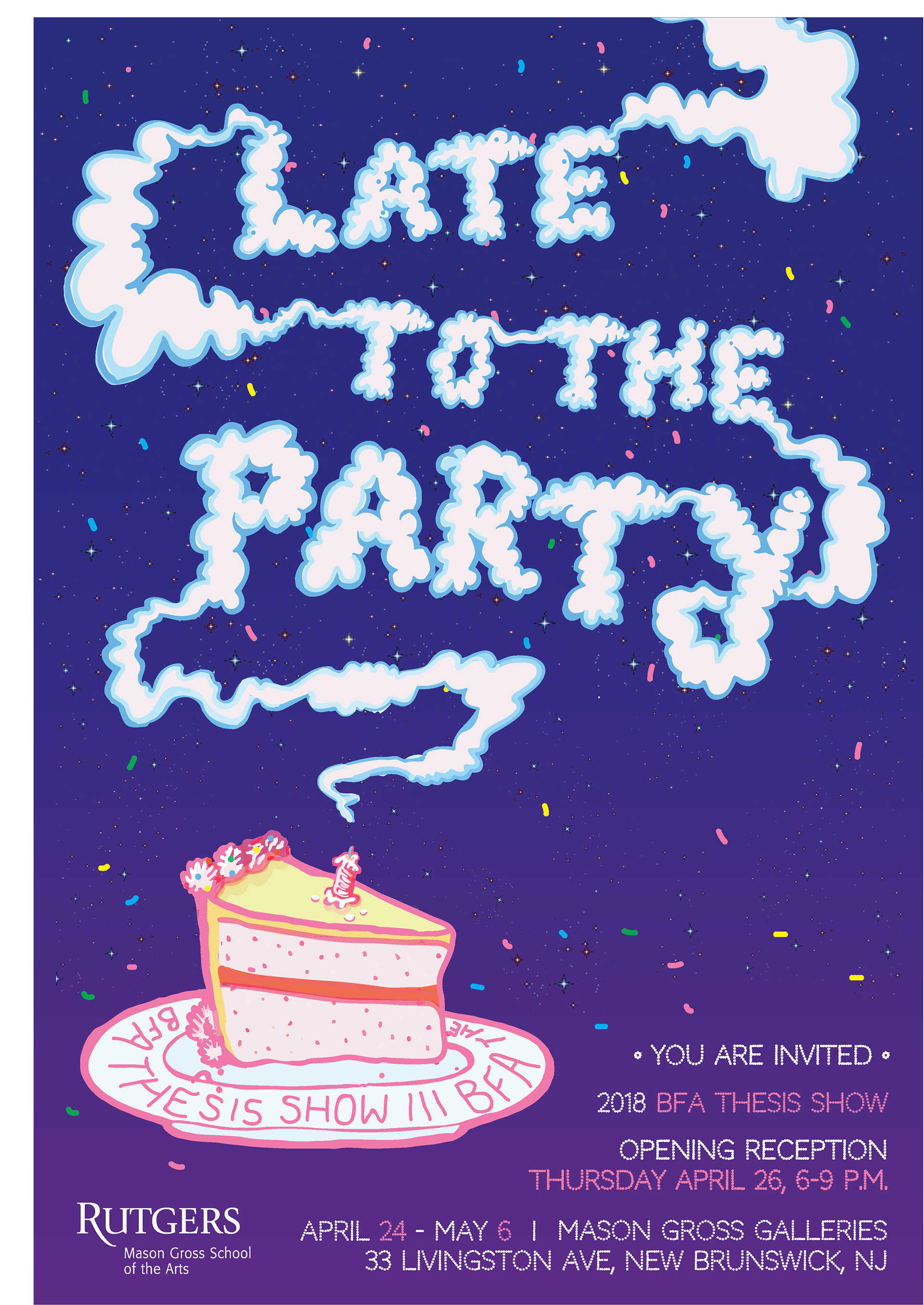 A graphic and poster created for the 2018 BFA Thesis exhibition at Mason Gross School of the Arts, "Late to the Party", and a poster for a First Friday at Mason Gross Galleries